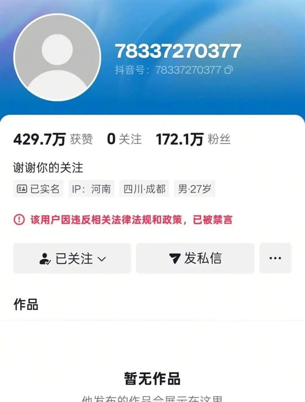 抖音账号页面显示,该用户因违反相关法律法规和政策,已被禁言。账号头像变灰,昵称变为一段数字。