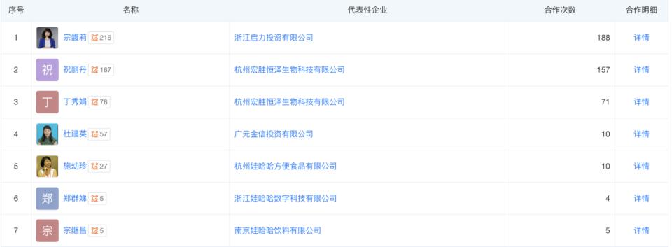 他与娃哈哈集团董事长宗馥莉和宏盛饮料集团法定代表人祝丽丹合作均超 150 次,后者则是宗馥莉的绝对 " 心腹 "。