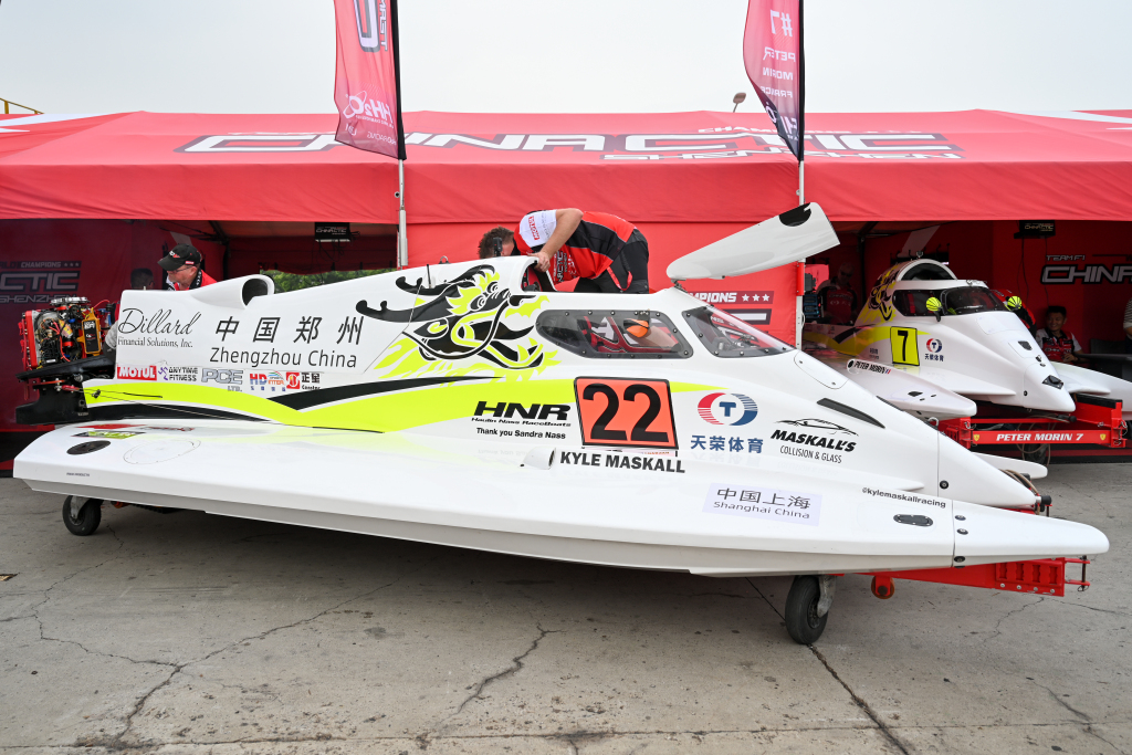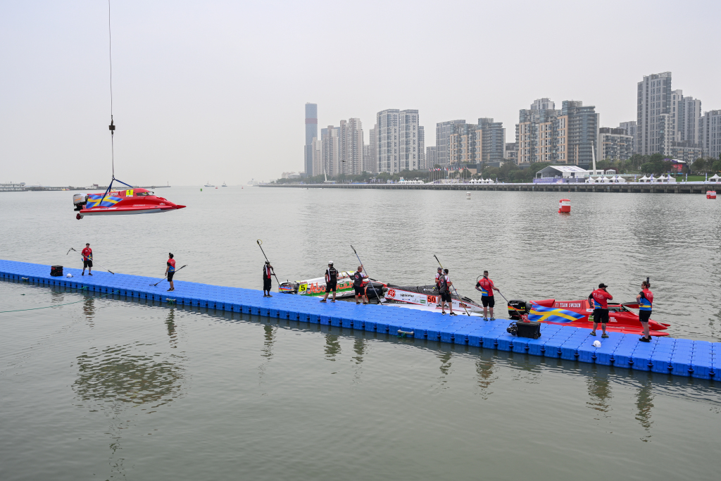 摩托艇被吊入比赛起点处。澎湃新闻记者 朱伟辉 图