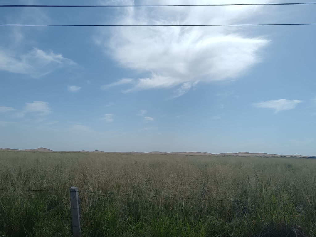 车轮行驶过最后一块农田,转而是无边的芨芨滩地。若说穿行戈壁时,满眼的砾石黄沙只会让人感觉前路被单调吞噬,心生倦怠的茫然,那么此时的茫茫白草只会让人深陷未知前路的恐惧,不知沿着这条路是否会顺利到达下一个地点。与两者相对的是,农田区会给人无比的安全感,因为穿越过一片片农田,终会走到炊烟升起的地方。
