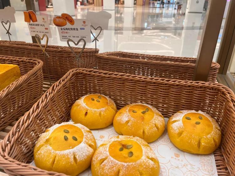 李新在社交媒体上被种草后,来五棵松万达店买过几次中式面包。就她尝过的金瓜枸杞软欧包、枸杞原浆牛角包来看,吃起来没有明显的中药味,反而是一种不太腻的甜味。