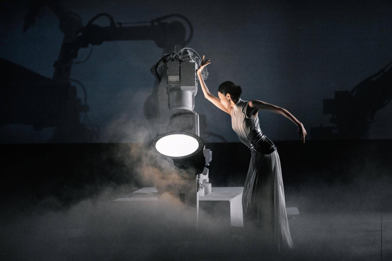 《朤月狂想曲》里,舞蹈家朱洁静与工业机械臂翩然共舞,在芯片晶体上叠化出“动能之月”的意象。