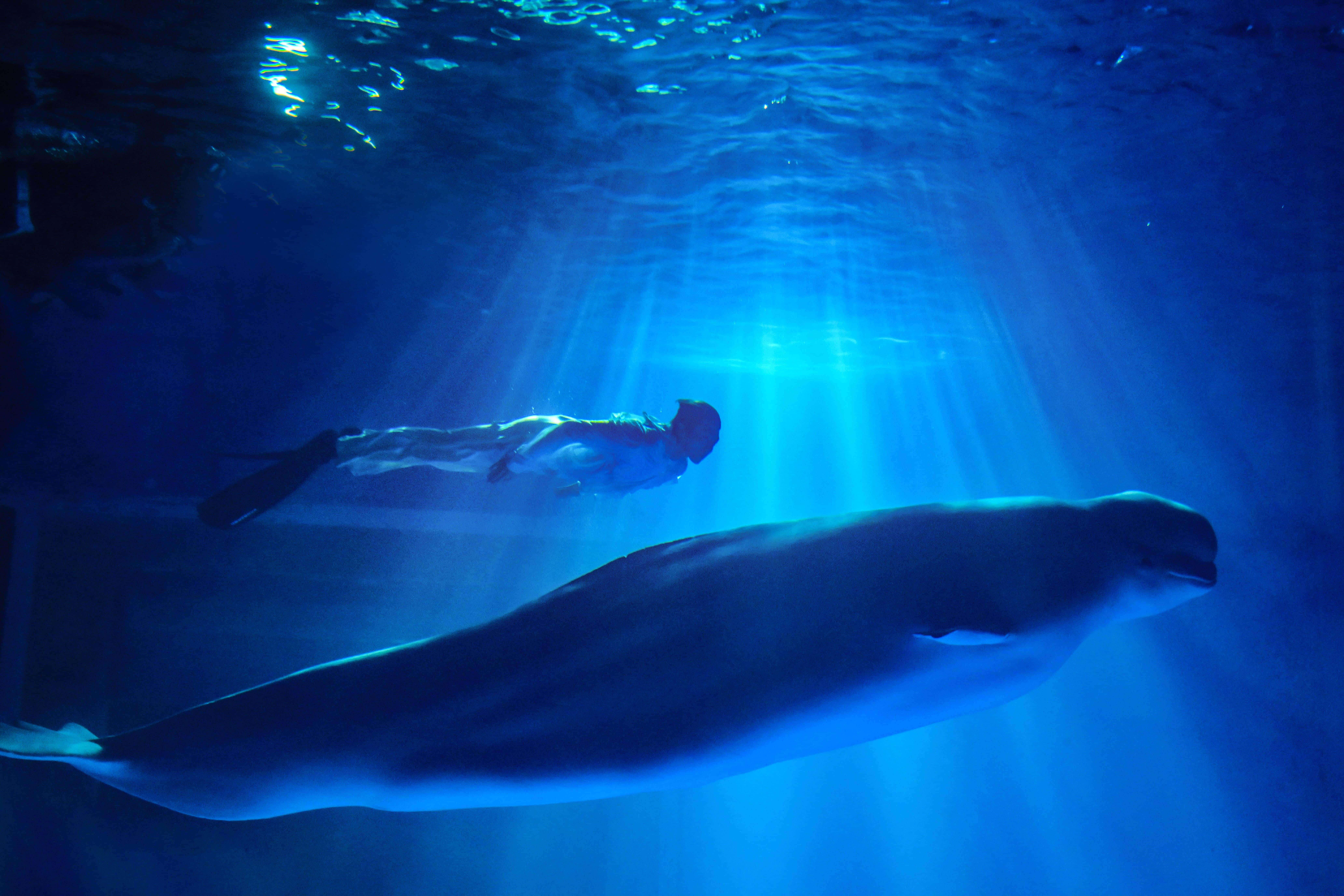 梦幻水舞秀《鱼·悦》取材于在临港发生的真实事件——一尾幼年蓝鲸搁浅于临港的海滩上,在当地市民的努力下,它被解救并放归东海。
