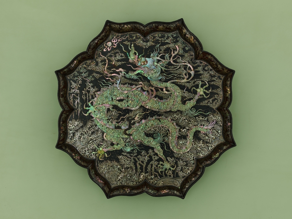 黑漆螺钿海水龙纹菱花形盘