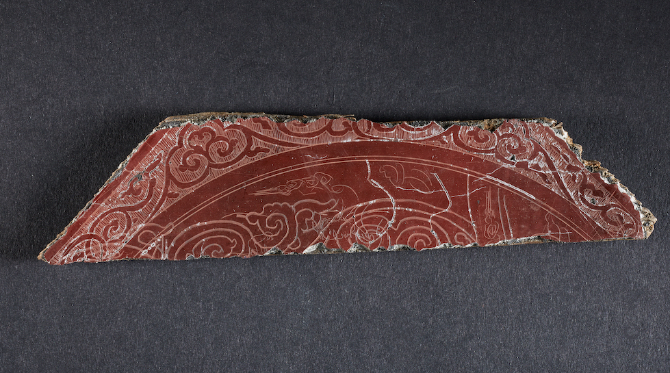 此残片呈不规则梯形,应为六角或八角形漆器盖残片。正面髹红漆为地,用刀刻三道圆弧纹为界,内区为连续蔓草和朵云纹, 外区 雕刻缠枝卷草纹,卷草纹周边有密集的竖线组成的锦地,锦地与纹饰齐平,宛如雕版一般的视觉感。