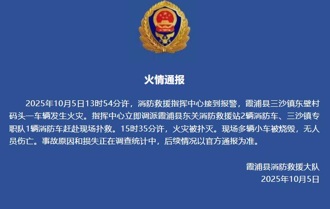 5 日晚,福建省宁德市霞浦县消防救援大队发布火情通报称,当日 13 时 54 分许,消防救援指挥中心接到报警,霞浦县三沙镇东壁村码头一车辆发生火灾。指挥中心立即调派霞浦县东关消防救援站 2 辆消防车、三沙镇专职队 1 辆消防车赶赴现场扑救。15 时 35 分许,火灾被扑灭。现场多辆小车被烧毁,无人员伤亡。事故原因和损失正在调查统计中,后续情况以官方通报为准。