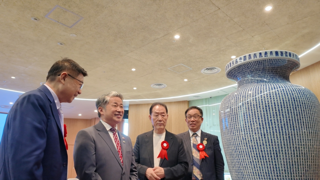 清康熙款青花万寿大尊展出现场,中国驻大阪总领事薛剑(左2)与收藏家吴稚亮(左3)等