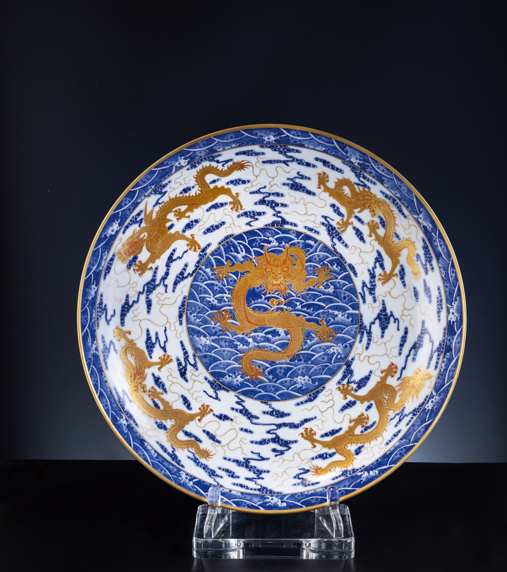 展厅中央,两件瓷器重器静置于特制展柜内,左侧,一件清康熙款青花万寿大尊巍然屹立,尊高逾七十厘米,通体以青花篆书密布一万个形态各异的“寿”字,布局严谨如星罗棋布,青花发色沉稳,釉面温润如玉;与之相呼应的,是一件清乾隆款青花红彩描金云龙纹大盘,盘心一条五爪金龙腾跃于云海之间,青花勾勒的祥云与矾红绘就的龙身形成强烈对比,再以纯金描绘龙鳞细节,金光熠熠,这两件珍品领衔的清代瓷器展,将观众带入清代中国陶瓷技艺的黄金时代。