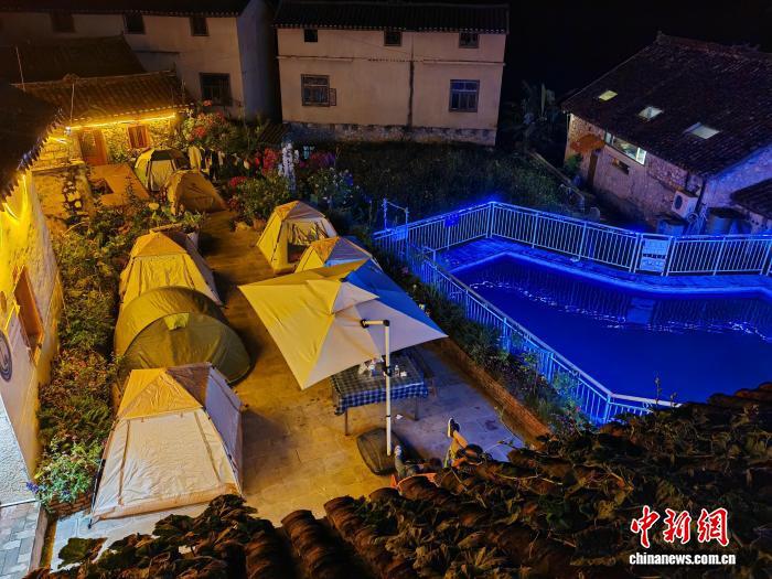 10 月 3 日,游客在贵州省贞丰县平街乡花江村村民林国权的民宿院子内搭帐篷。 ( 受访者供图 )