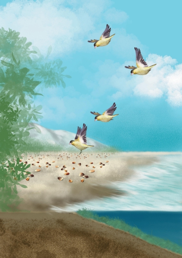 黄雀一头扎进水中,随即摇身一变,成为水边的蛤蜊。