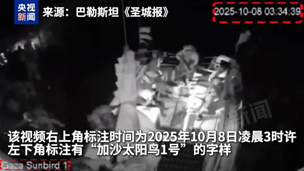 另一段由巴勒斯坦《圣城报》发布的以色列海军登船后的视频显示,有一群武装人员登上船只,随后一名武装人员手持步枪爬上船只桅杆,并用步枪撞击摄像头。该视频右上角标注的时间为 2025 年 10 月 8 日凌晨 3 时许,左下角标注有 " 加沙太阳鸟 1 号 " 的字样。