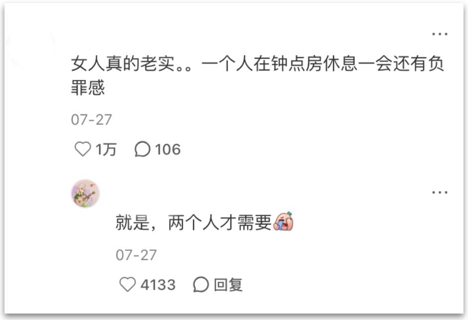 网友感慨:" 女人真老实,一个人在钟点房休息一会儿都有负罪感。"