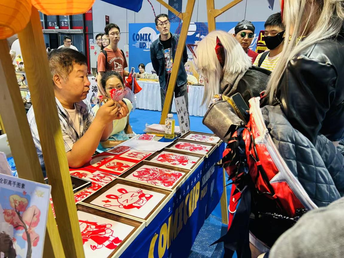 来自上海群众艺术馆的专职剪纸师钟旭,这次和非遗团队一起参展。他告诉澎湃新闻,非遗传承人主动走进CP展,一方面是想找到传统文化“年轻化表达”的方法,另一方面也希望向二次元群体传播传统技艺:“其实《哪吒闹海》《天书奇谭》也是早期的‘二次元’,它们本身就是宣传中国传统文化的好载体,我们想做的,就是找到这种古今对话的共鸣点。”