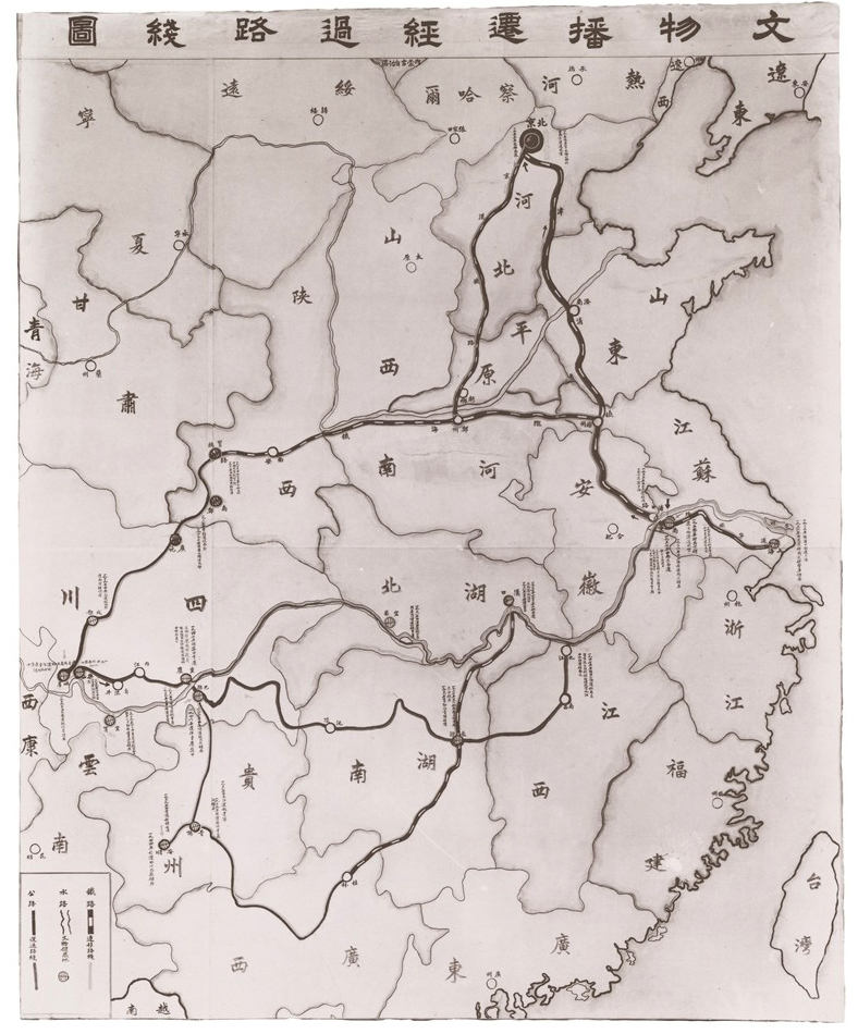 1950年代绘制的故宫文物迁徙路线图,现藏于故宫博物院。故宫博物院 图