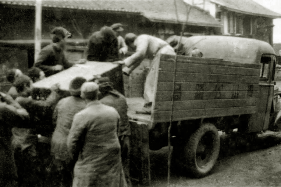 南迁的故宫文物在贵州被卡车运送的场景。新华社 图