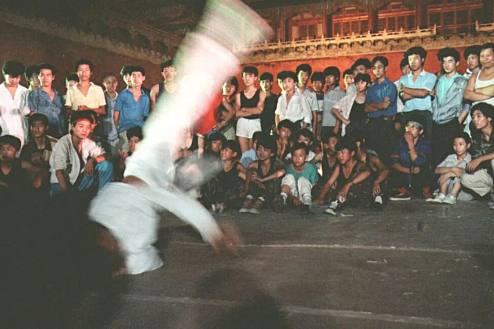 1988年,年轻人在午门广场表演霹雳舞。李明放/新华社 图