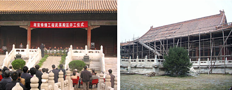 左:武英殿大修开工仪式,右:武英殿施工现场