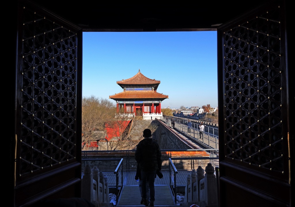 2015年12月4日,北京,游人在午门至东华门城墙上游览。为庆祝故宫博物院成立90周年,紫禁城城墙首次开放,为游人提供了“空中”参观故宫的新视角。