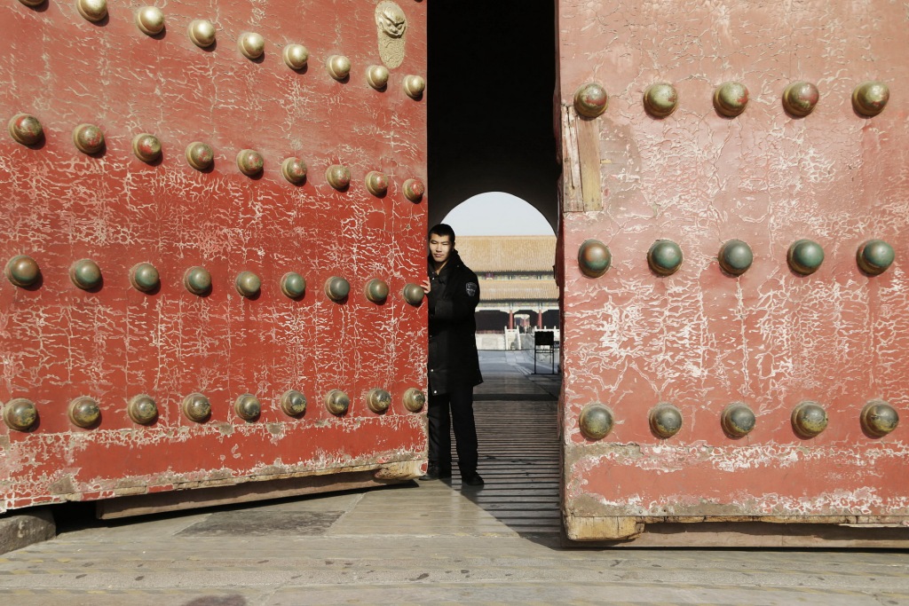 2013年1月7日11时许,首次试行淡季周一闭馆半天,一名工作人员正在关闭故宫入口处大门。