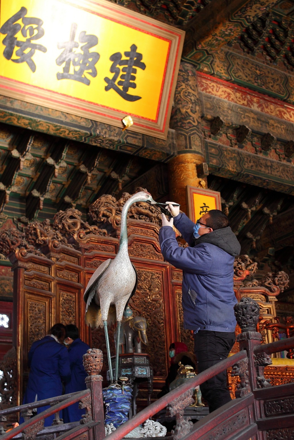 2014年1月20日,专家正在给太和殿内皇帝宝座旁的珐琅仙鹤清理灰尘。