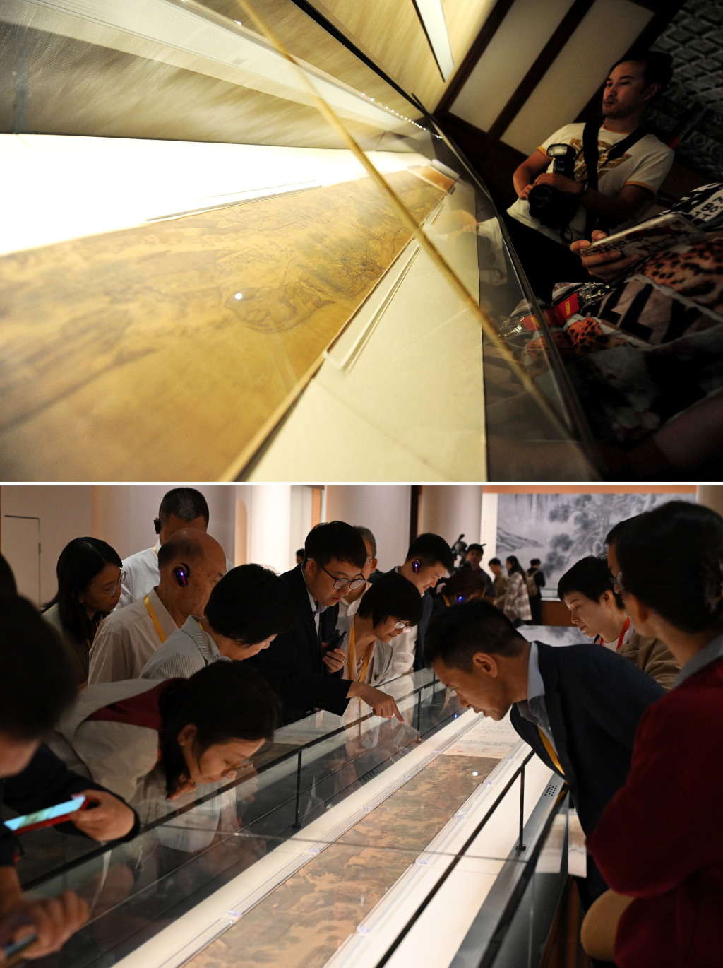 上:2015年9月8日,北京,《清明上河图》亮相故宫《石渠宝笈》特展。下:2025年9月29日,工作人员为观众讲解北宋张择端的《清明上河图卷》。 田雨昊/中新社 图