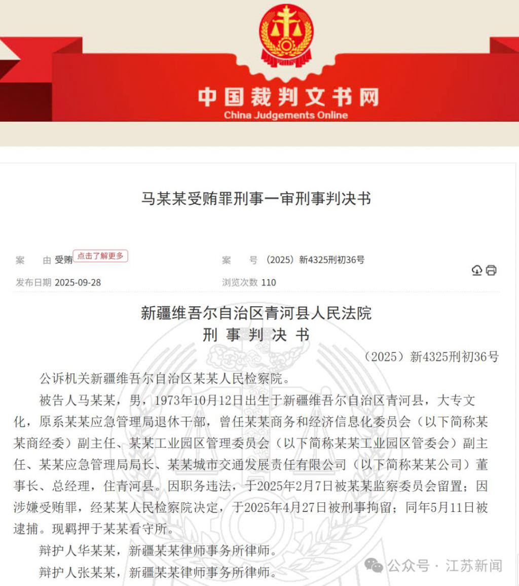 今年 8 月 26 日,新疆维吾尔自治区青河县人民法院一审判决被告人马某某犯受贿罪,判处有期徒刑十年,并处罚金人民币五十万元;依法追缴被告人马某某违法所得 24.5 万余元,已追缴并扣押的违法所得 161.9 万余元由扣押机关上缴国库。