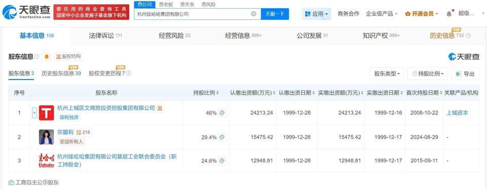 天眼查信息显示,宏辉食品控股股东是杭州宏宸营销有限公司,后者持有宏辉食品 100% 股权。而杭州宏宸营销有限公司是宏胜饮料集团有限公司(以下简称宏胜集团)100% 控股的公司。此外,天眼查信息显示," 娃小宗 " 的商标目前归宏胜集团所有,商标申请日期显示为 2025 年 5 月。