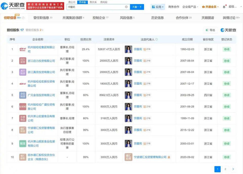 天眼查任职信息显示,宗馥莉名下关联 210 余家企业,其中 200 余家为存续或开业状态,包括娃哈哈商业股份有限公司、杭州娃哈哈集团有限公司、杭州娃哈哈集团有限公司等,宗馥莉在上述企业中分别担任董事长、总经理等职务,并持有 10 余家企业股份。