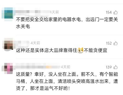 李女士称,该智能马桶是某知名品牌的仿版,折后价仅 1090 元。事后李女士心有余悸:" 还好我不在家,不然就把我炸了!"