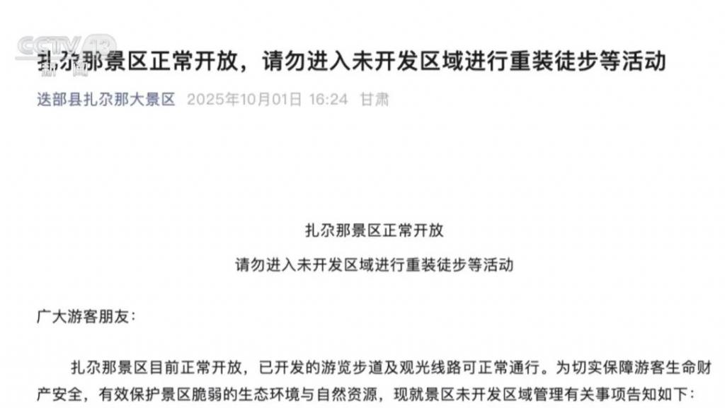 假期第一天,扎尕那景区宣布,严禁任何组织或个人未经批准擅自进入其未开发区域开展重装徒步等活动。