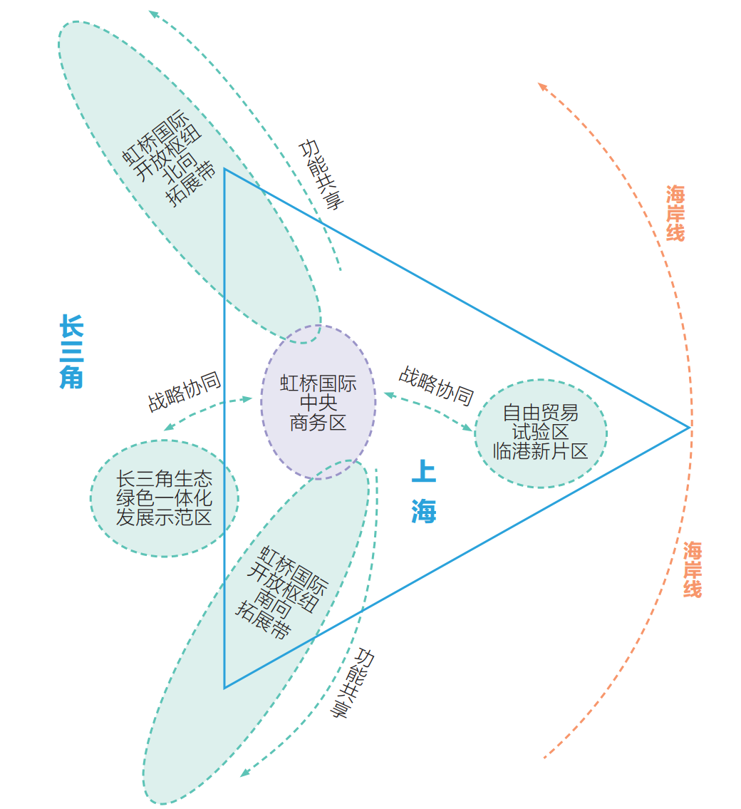 有别于大空间尺度的长三角一体化发展战略,也不同于自由贸易试验区临港新片区、长三角生态绿色一体化发展示范区等功能载体,虹桥国际开放枢纽呈现多战略嵌套、相对精准、“点—线—面”系统的显著特征。