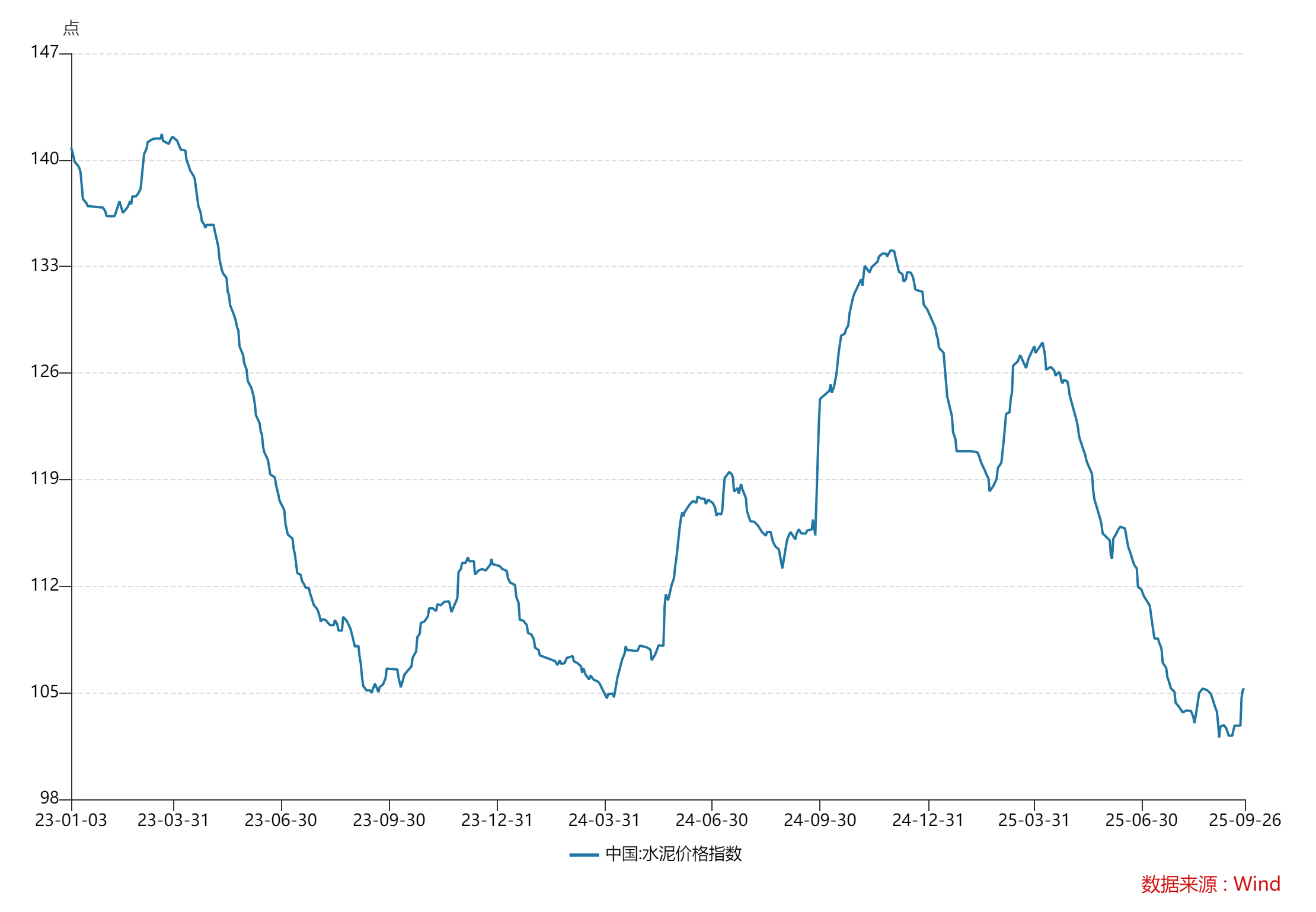 价格持续下滑也印证了市场竞争的加剧。Wind数据显示,截至9 月底,水泥价格指数为 105.4,相较 2024 年底的 130.08 下滑 19%,相较 2023 年初的 140.82 下滑 25%,其中第三季度单季度下滑 5.7%。“水泥价格的持续走低,直接影响企业的营收与利润,塔牌集团虽然通过降本增效和投资收益弥补了部分损失,但长期来看,价格下行趋势若不改,主业盈利压力会越来越大。” 赵彤表示。