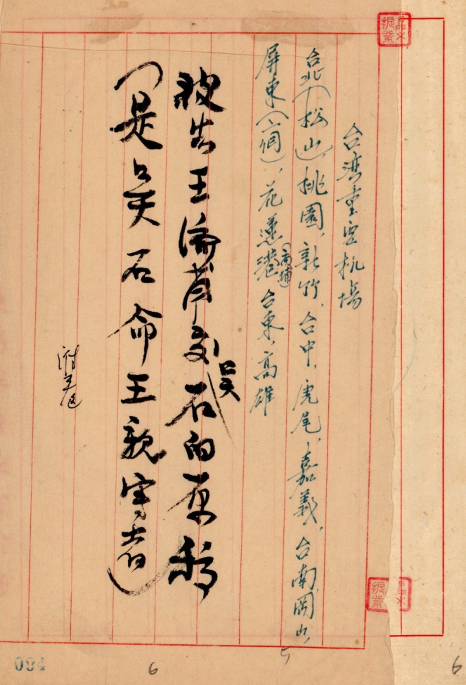 ▲吴石从王济甫处获得的台湾重要机场情形。此件由保密局特务人员注明“被告王济甫交吴石的原稿(是吴石命王亲写者)”。