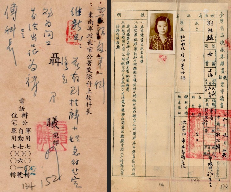 ▲聂曦委托台湾省警务处为马雯娟(化名“刘桂麟”)办理出境证,聂曦在名片上写道:兹有刘桂麟小姐急待赴定海,乞赐为关照发给出口证为祷。