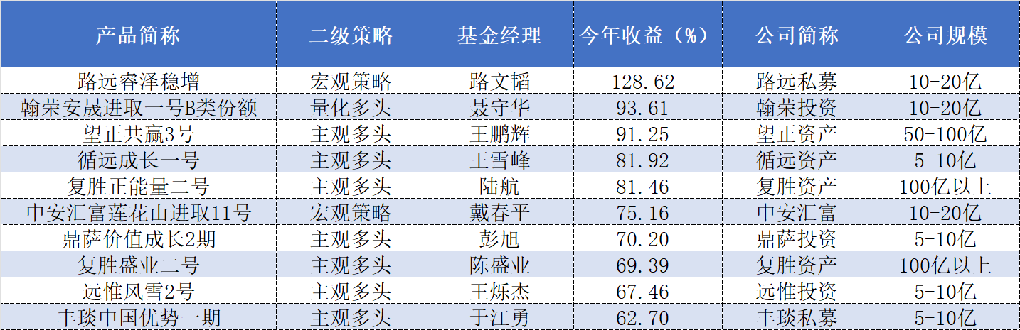 在所属私募公司管理规模超过5亿元的一众“公奔私”基金经理管理的产品中,路远私募路文韬旗下的宏观策略产品“路远睿泽稳增”以高达128.62%的年内收益率排名居首,翰荣投资聂守华旗下的量化多头产品“翰荣安晟进取一号B类份额”和望正资产王鹏辉旗下的主观多头产品“望正共赢3号”今年以来的收益率也分别高达93.61%和91.25%。