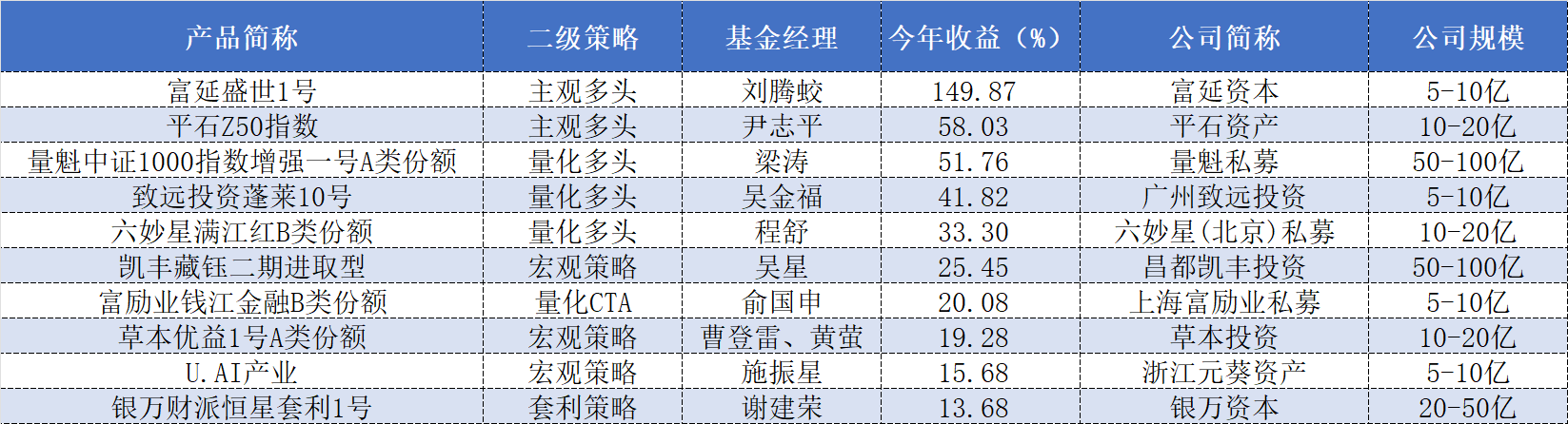 (数据截至2025年9月19日,参与排名产品所属私募公司规模需在5亿以上,同基金经理管理的多只相同二级策略产品,仅选取今年以来收益最高的参与排名)