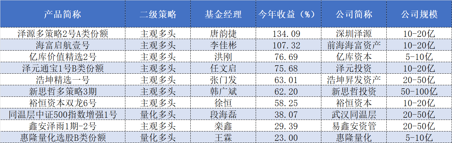 “民间派”基金经理旗下符合相关排名规则的产品今年以来收益前十榜单的上榜门槛为23.00%,排名居于前三位的分别为深圳泽源唐韵捷管理的“泽源多策略2号A类份额”、前海海富资产李佳彬管理的“海富启航壹号”以及亿库资本洪刚管理的“亿库价值精选2号”,今年以来的收益率分别为134.07%、107.32%和76.69%。泽元投资的任文启、浩坤昇发资产的张门发、新思哲投资的韩广斌、裕恒资本的徐恒等其他多位“民间派”基金经理旗下也均有产品今年以来收益超过50%。