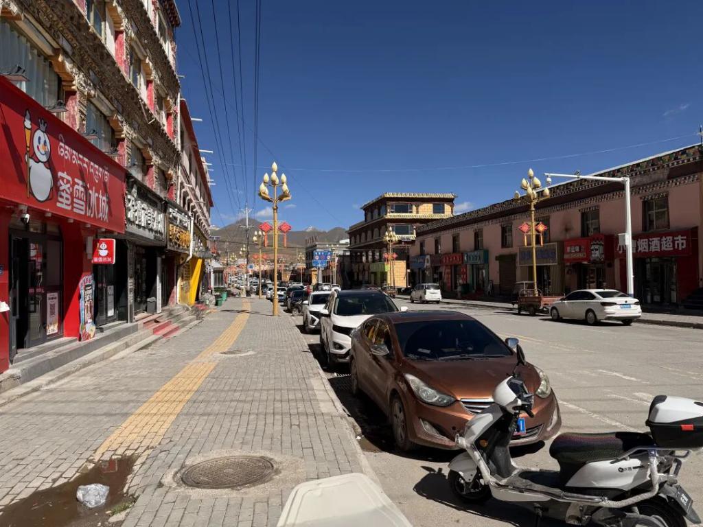 那条曾经全是土房的县中心街道,如今变成百余家店铺林立的商业步行街,附近光超市就开了近30家。路首的蜜雪冰城和幸运咖人气最旺,整日用音响循环播放藏汉双语广告。