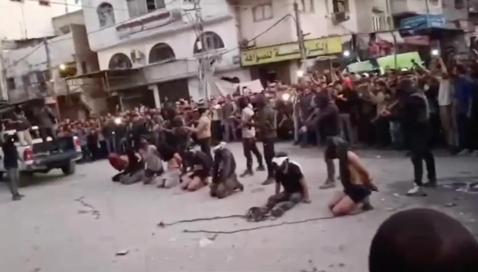 视频中,八名被蒙眼、重度殴打的男子跪在街头,被哈马斯枪手在欢呼人群前射杀。据 BBC 报道,哈马斯未提供证据,称处决对象为 " 罪犯及以色列合作者 "。据以色列媒体 Ynet News,受害者包括艾哈迈德 · 齐丹 · 塔拉宾,据称他为非哈马斯盟友的民兵组织招募特工。