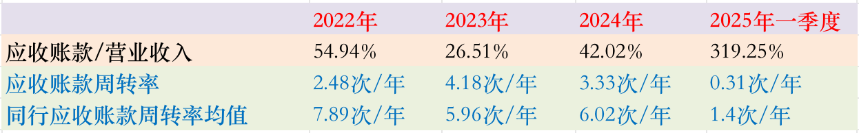 2022年至2025年一季度,莱普科技的应收账款周转率分别为2.48次、4.18次、3.33次和0.31次,而同期行业均值分别为7.89次、5.96次、6.02次和1.4次。