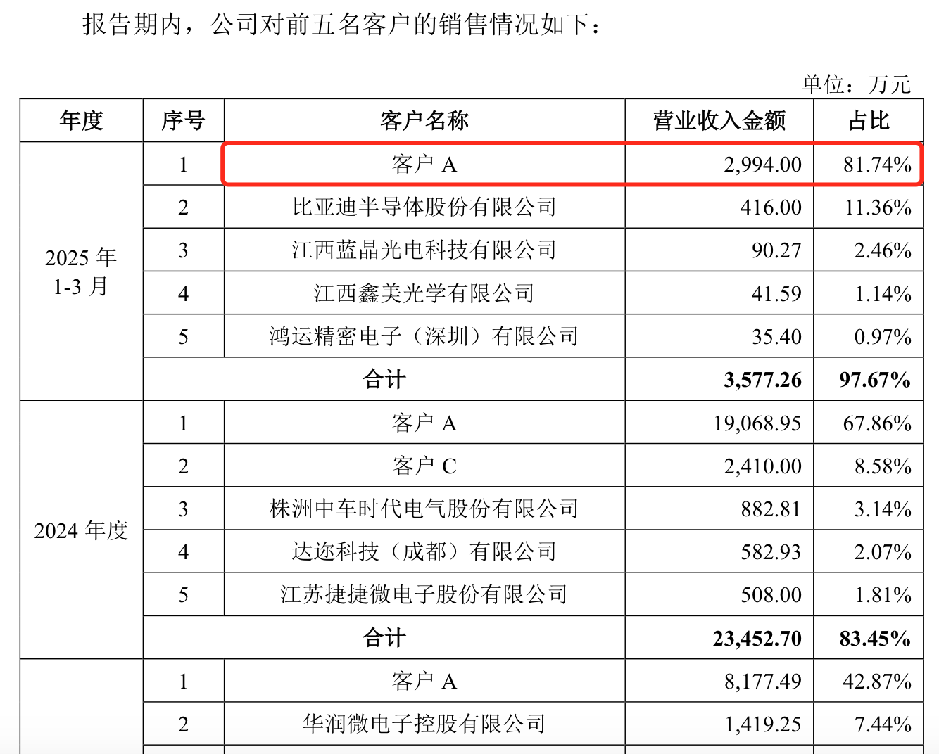 2022年至2025年一季度,公司向前五大客户销售金额占当期营业收入的比例分别为66.86%、65.89%、83.45%和97.67%。其中,客户A及其同一控制下的其他主体销售金额占比从18.86%激增至81.74%。