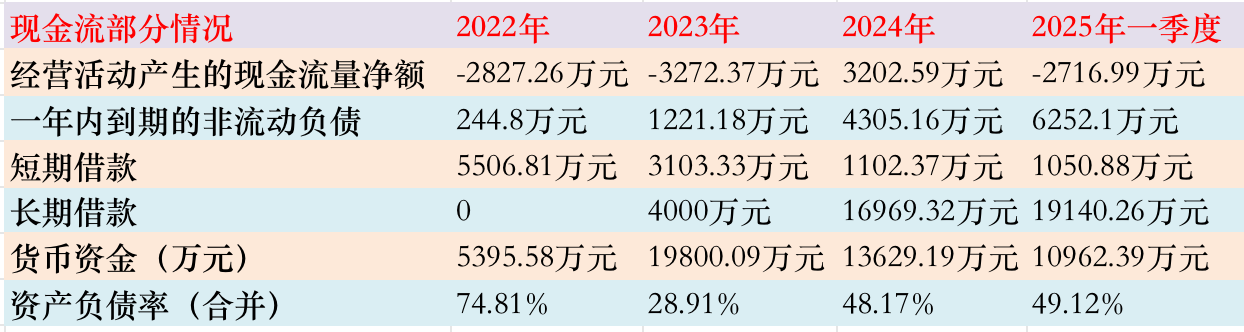 多重因素叠加下,公司经营活动产生的现金流量在报告期内出现了净流出的情况,2022年至2025年一季度的净额分别为-2827.26万元、-3272.37万元、3202.59万元和-2716.99万元。