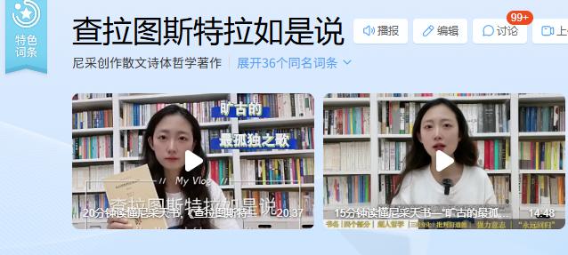 回到 2020 年底,当时摘菌在视频网站上分享了第一本书:尼采的散文诗体哲学《查拉图斯特拉如是说》。如今,这本书在百度百科首页上的介绍视频,就是摘菌的。