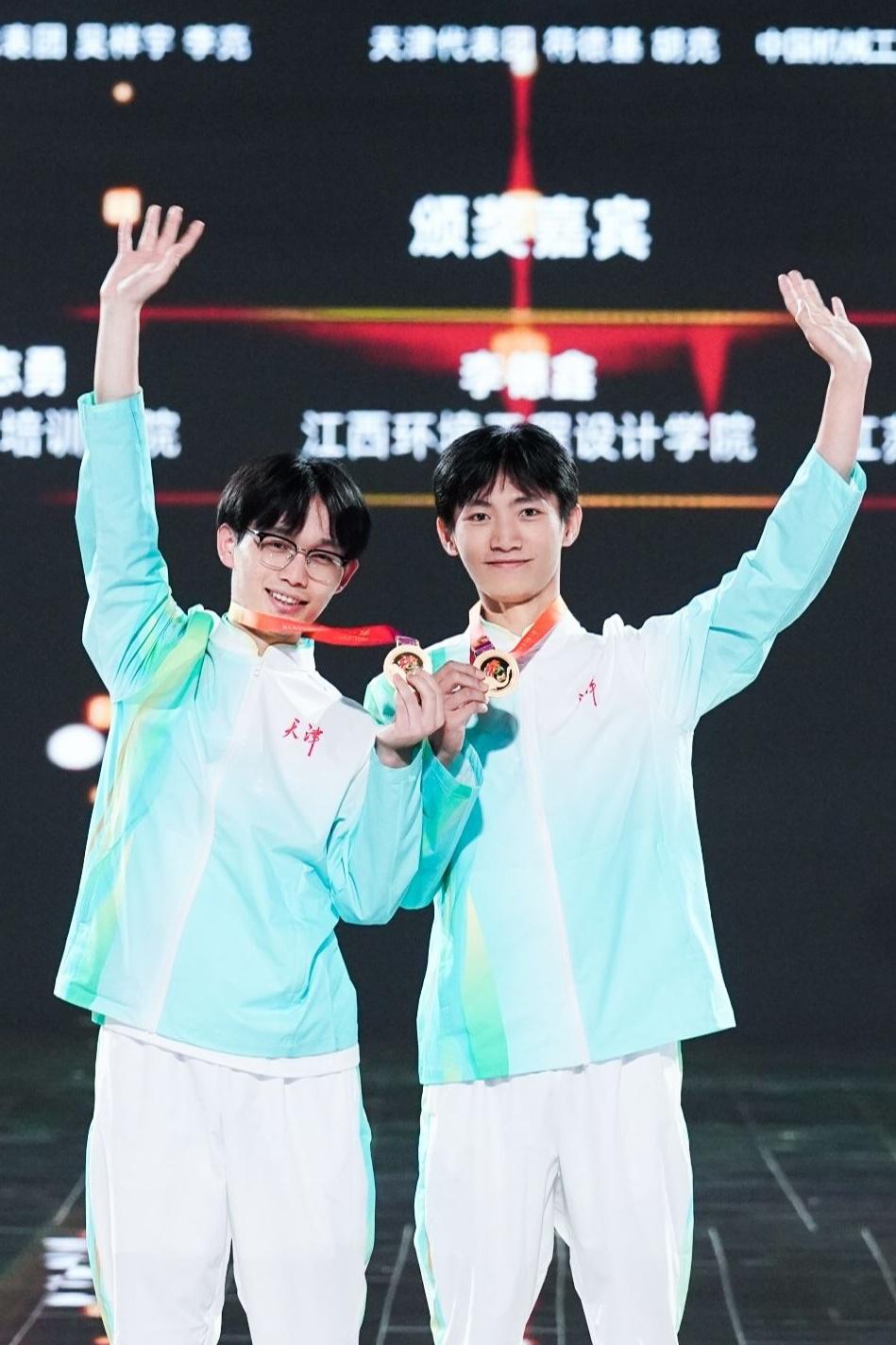 胡亮(左)与同伴斩获金牌(央广网发 天津职业技术师范大学供图)