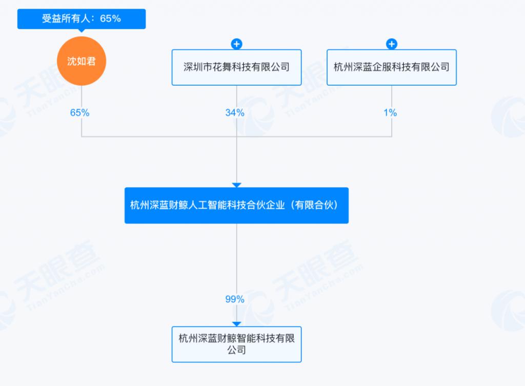 杭州精算家的最大股东是深圳市花舞科技有限公司,该企业的实际控制人为靳春平,靳春平同时也是深蓝财鲸的实控人。
