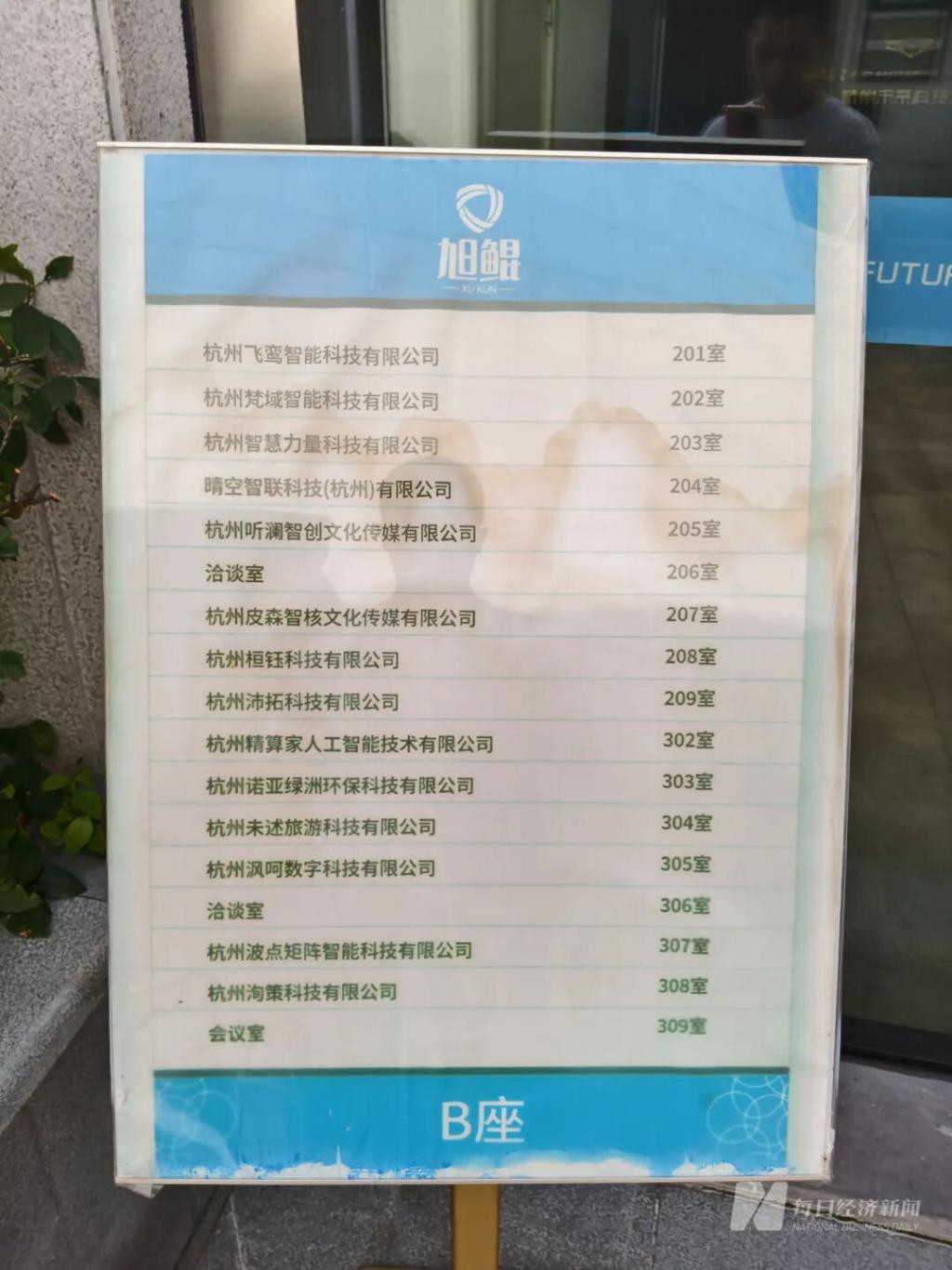 深蓝财鲸成立于今年 7 月 21 日,注册地址为浙江省杭州市余杭区仓前街道景兴路 999 号 10 幢 303-27 室,10 月 9 日,记者实地走访发现,该地址位于杭州未来科技城的梦想小镇天使村,但根据楼层指引,303 室为 " 杭州诺亚绿洲环保科技有限公司 " 的办公地。