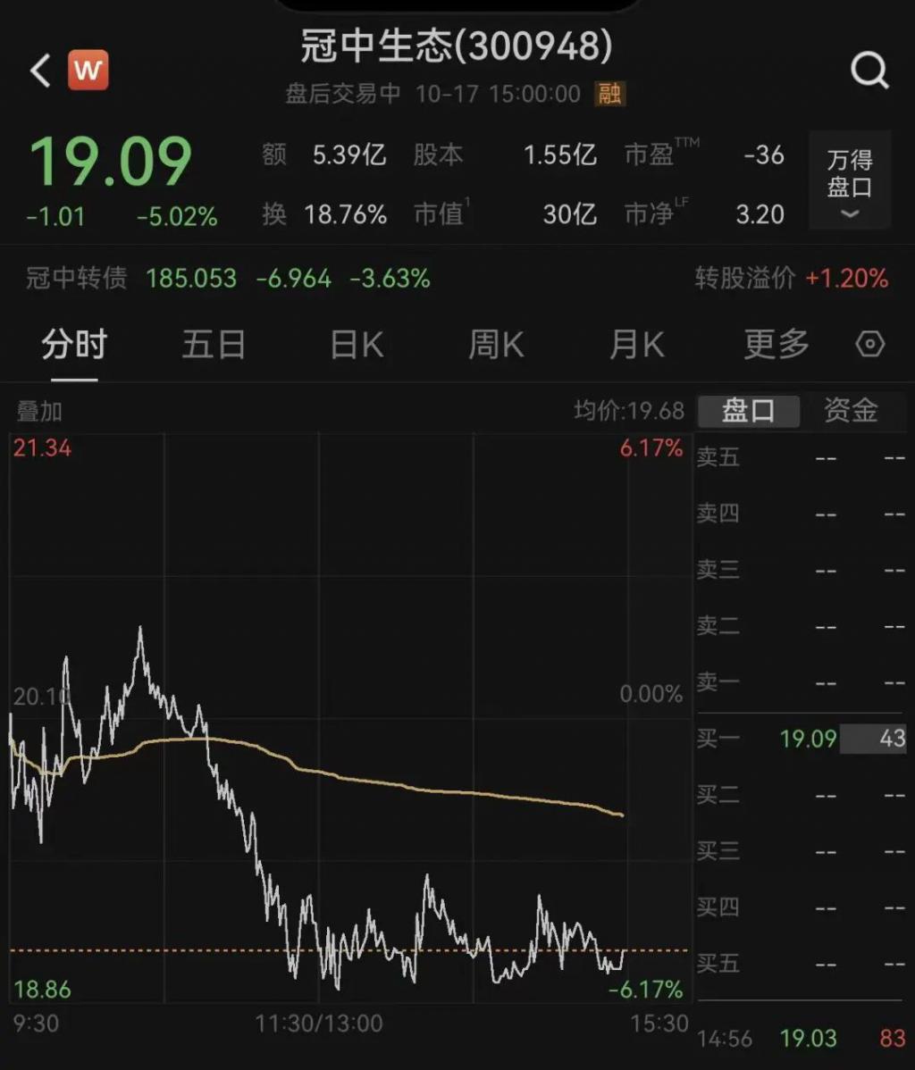 10 月 16 日,冠中生态收于 20.10 元 / 股,涨幅 2.97%。10 月 17 日,冠中生态收于 19.09 元,跌幅 5.02%。