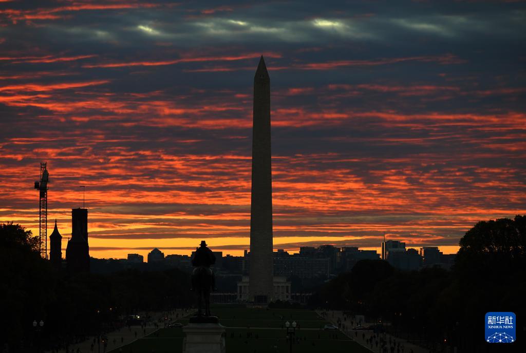 这是 10 月 15 日拍摄的日落时分的美国华盛顿纪念碑。新华社记者 李睿 摄