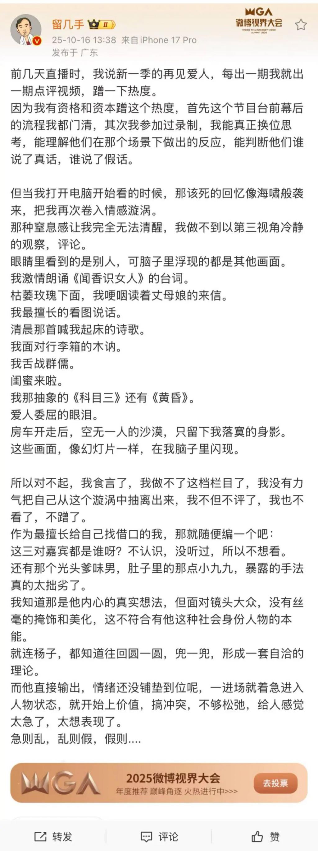 新一季《再见爱人》开播后,留几手发文表示不会更新《再见爱人 5》的点评视频,坦言再回忆节目会有窒息感。此外他还调侃新一季嘉宾(路行)的表现 " 过于急切 "" 不够松弛 ",认为其有刻意表达制造冲突之嫌。