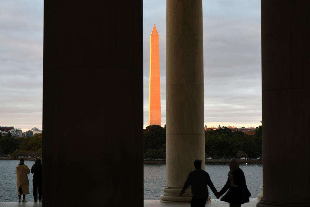 这是 10 月 14 日在美国华盛顿杰斐逊纪念堂拍摄的日落时分的华盛顿纪念碑。新华社记者李睿摄